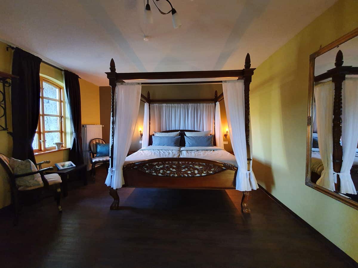 Ein Kingsize Himmelbett, eine antike Kommode und zwei schöne Stühle lassen euch einen Hauch kolonial-englischen Stils in dieser kleinen Suite spüren.