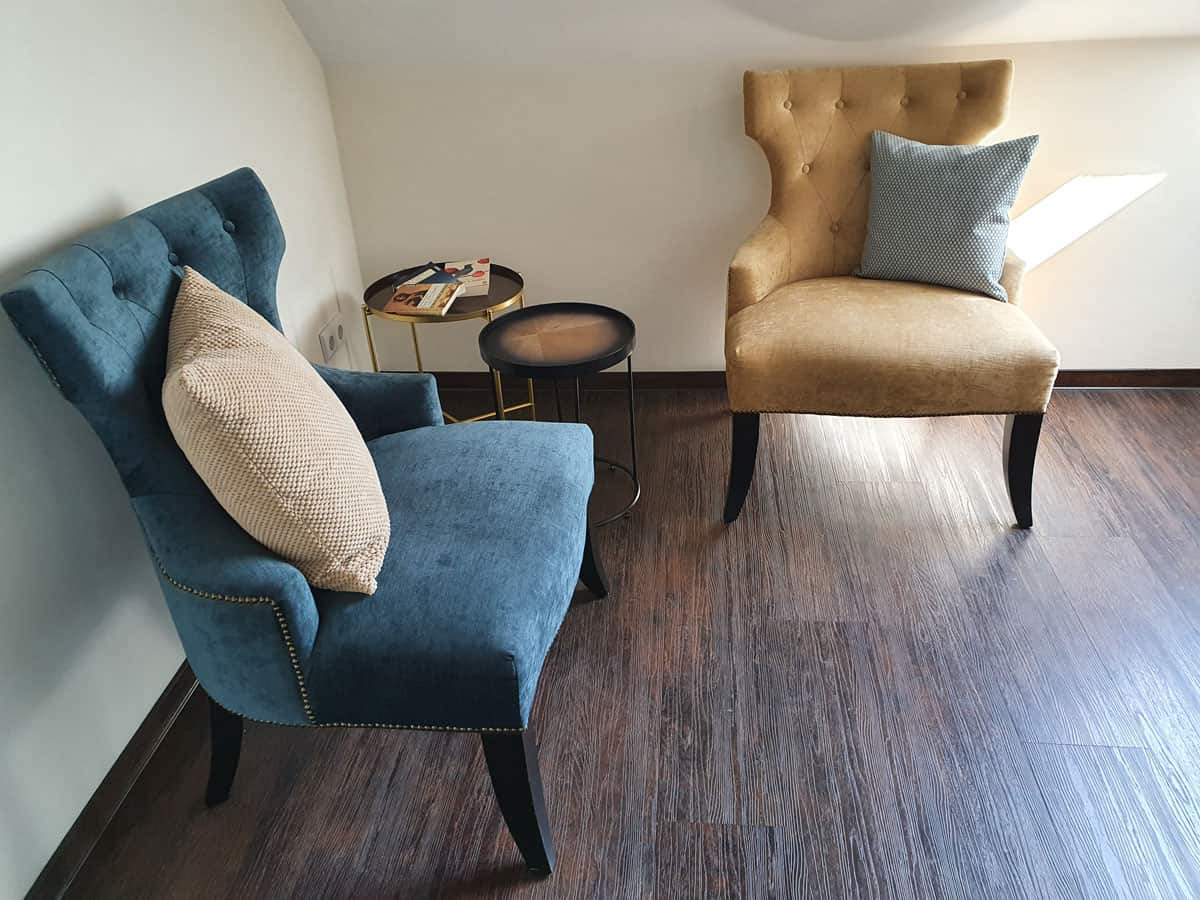 Eine Sitzecke mit zwei bequemen Sesseln sowie eine moderne Schrank-Hänge-Kombination aus Bambus versprechen euch zusätzlichen Komfort.