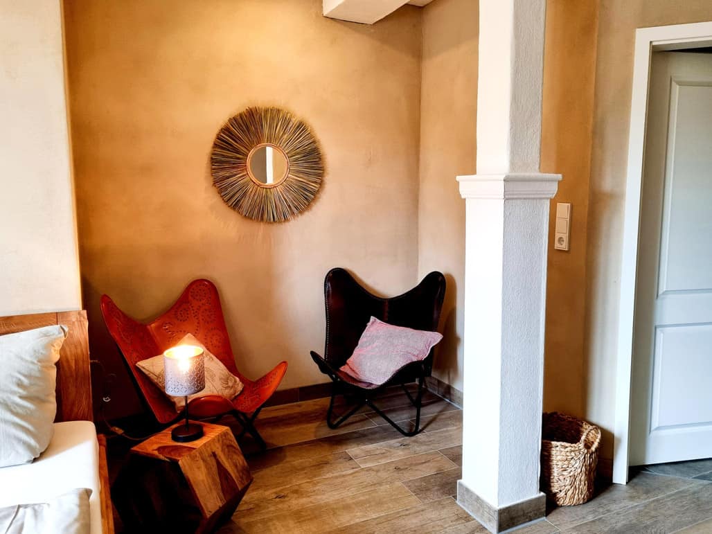 Traumhafte Vorhänge, eine Sitzecke mit 2 Vintage Sesseln und einer handgefertigten Komode aus Flussakazie bietet euch diese Wohlfühloase.