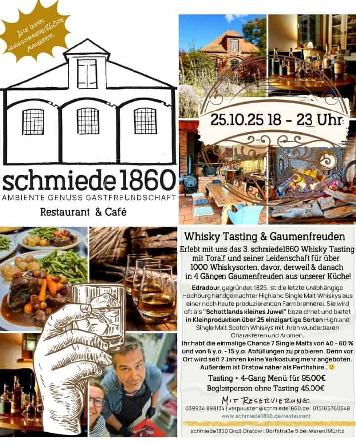 schmiede1860 Dorfstraße 5, Schloen-Dratow / OT Groß Dratow, Germany3. Whisky-Tasting & Gaumenfreuden Erlebt mit uns das 3. schmiede1860 Whisky-Tasting mit Toralf und seiner Leidenschaft für über 1000 Whiskysorten, davor, derweil & danach in 4 Gängen Gaumenfreuden aus unserer Küche! Edradour, gegründet 1825, ist die letzte unabhängige Hochburg handgemachter Highland Single Malt Whiskys aus einer noch heute produzierenden Farmbrennerei. Sie wird oft als "Schottlands kleines Juwel" […]