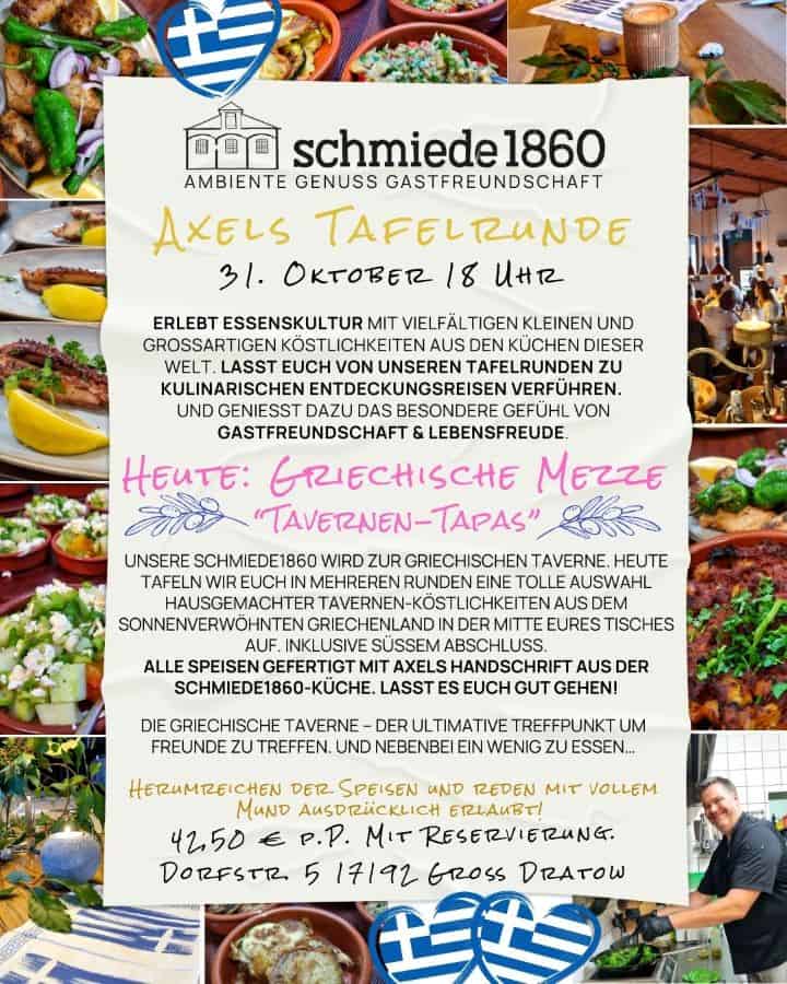 schmiede1860 Dorfstraße 5, Schloen-Dratow / OT Groß Dratow, Germanyschmiede1860 Event: Axels Tafelrunde Erlebt Essenskultur mit vielfältigen kleinen und großartigen Köstlichkeiten aus den Küchen dieser Welt. Lasst euch von unseren Tafelrunden zu kulinarischen Entdeckungsreisen verführen. Und Genießt dazu das besondere Gefühl von Gastfreundschaft & Lebensfreude. Herumreichen der Speisen und Reden mit vollem Mund ausdrücklich erlaubt! Heute: Griechische Mezze "Tavernen-Tapas" Unsere schmiede1860 wird zur Griechischen Taverne. […]
